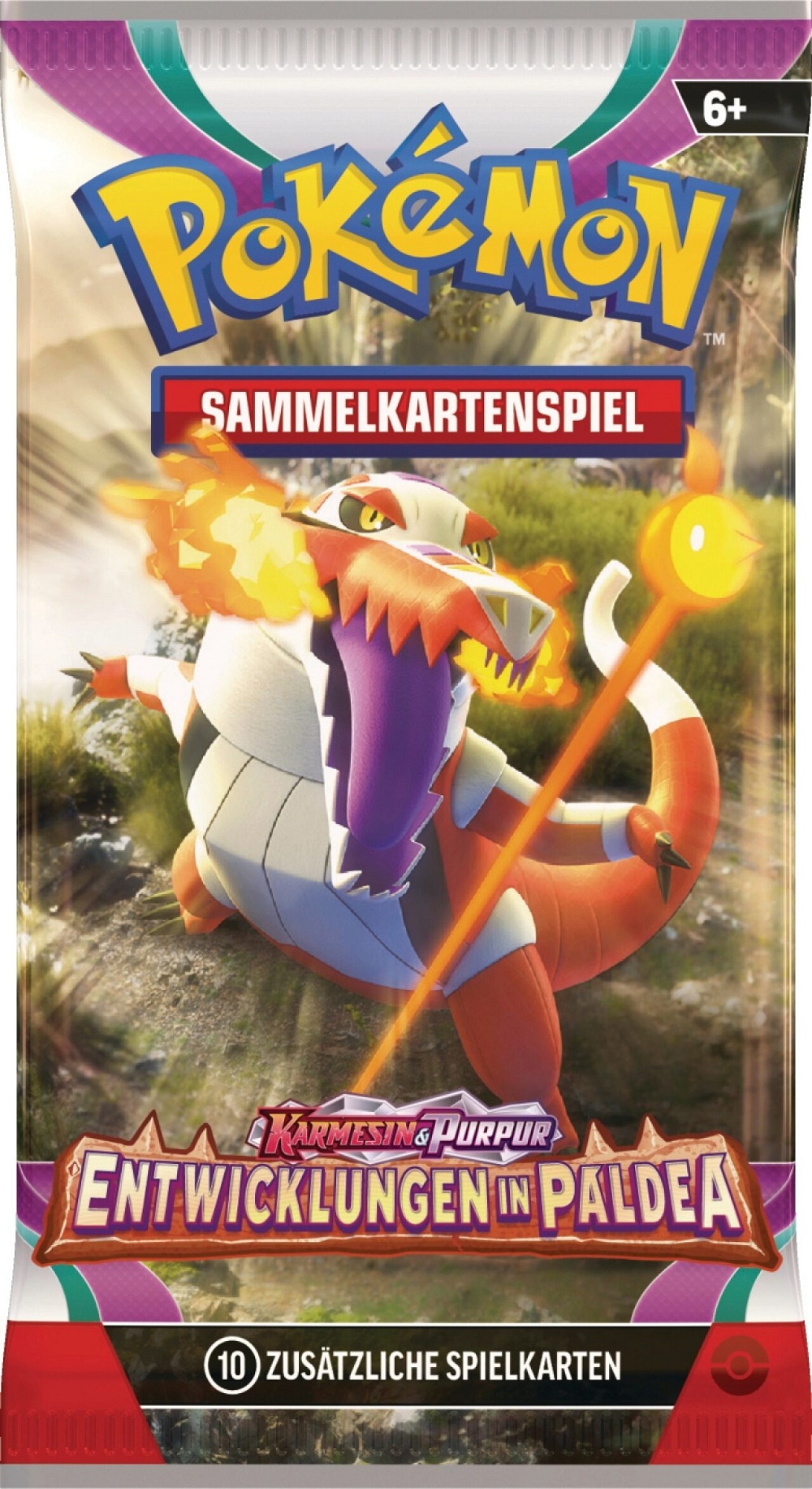 Neue Mächte erwachen, bedrohliche Legenden offenbaren sich – es herrscht Hochspannung! Die ersten Partner-Pokémon haben sich entwickelt und jetzt betreten Maskagato-ex, Skelokrok-ex sowie Bailonda-ex die Bühne mit faszinierendem Zauber, Gesang und Tanz. Forstellka, Laschoking und Dedenne glänzen derweil als Terakristall-Pokémon-ex und Baojian-ex, Dinglu-ex und andere bergen beängstigende Kräfte, deren Kontrolle viel Mut verlangt. Selbst Pikachu gesellt sich zu den Pokémon-ex in der Pokémon-Sammelkartenspiel-Erweiterung Karmesin & Purpur – Entwicklungen in Paldea!
